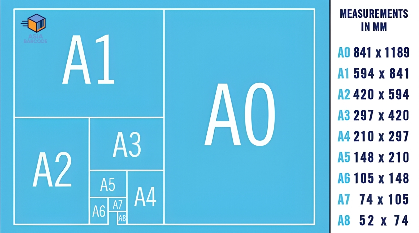 Bảng tra kích thước khổ giấy A0, A1, A2, A3, A4, A5, A6, A7 chuẩn mm/cm. Hướng dẫn chọn khổ giấy tối ưu chi phí in ấn tại AsiaBarcode.
