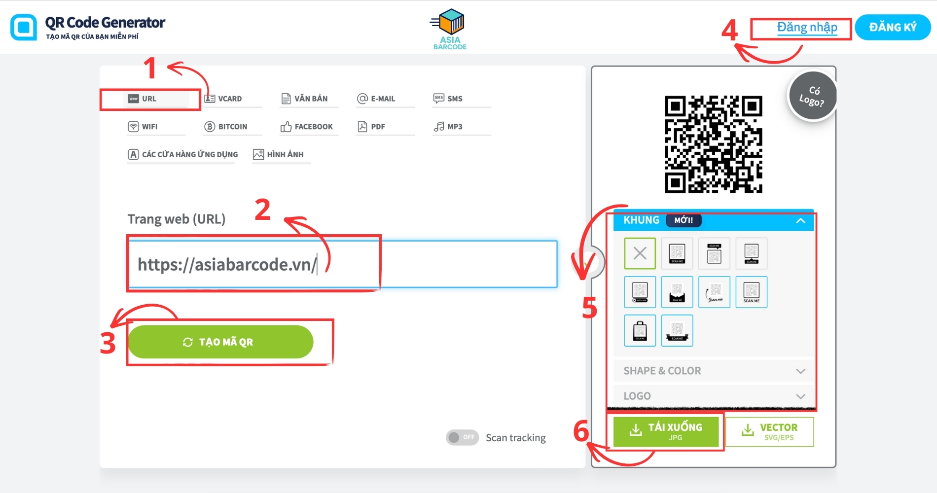 Bước 5: Đăng nhập/ đăng ký để tải file QR và kiểm tra khả năng quét trước khi in