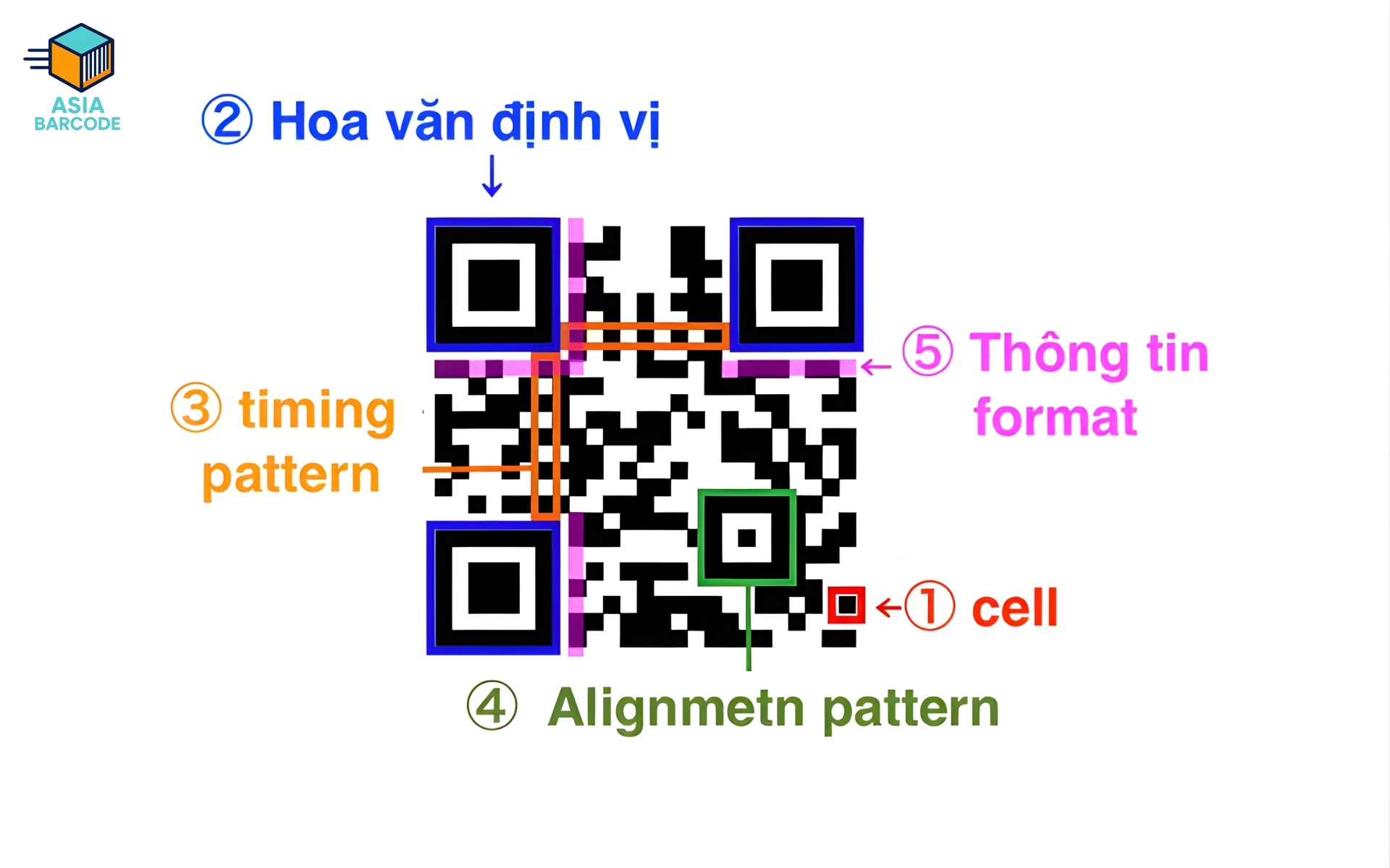 Việc hiểu rõ cấu trúc mã QR Code là yếu tố quan trọng giúp doanh nghiệp in mã QR đúng kỹ thuật, đảm bảo quét được ổn định trên nhiều chất liệu như giấy, decal, nhựa, túi giấy, hộp giấy. Các thành phần chính trong cấu trúc mã QR Code: